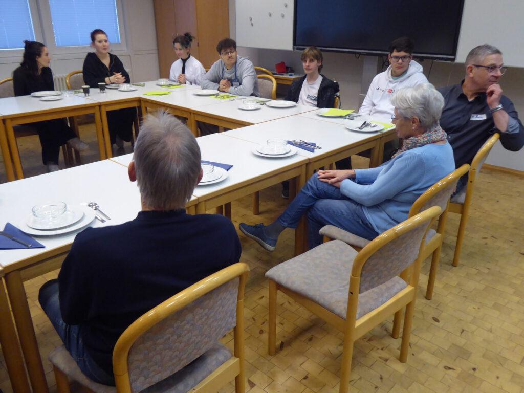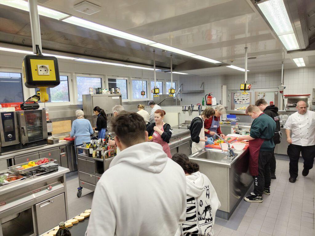 Die vom Koch-Profi Menges gut vorbereitete praktische Küchenarbeit auf der Grundlage von Rezepten, die die Teilnehmerinnen und Teilnehmern vorher erstellt hatten, begann mit der Einteilung von generations- und schulformübergreifenden Arbeitsgruppen. In diesen wurden Vorspeisen (Bruschetta und Hummus) vegetarische Hauptgerichte (Reis mit Gemüse, Kartoffelgulasch, mediterranes Ofengemüse) und Nachspeisen (Obstsalat mit Eis, Sahnepudding mit Weintrauben und Crunch) hergestellt. Es war eine Freude zu beobachten, wie harmonisch und gesprächsintensiv das Zusammenwirken von Jung und Alt an den Arbeitsplätzen in der Küche der BBS Stadthagen ablief. In den Begleitgesprächen ging es nicht nur um die Zubereitung der Gerichte, sondern auch um die Lebenserfahrungen der Älteren sowie die angestrebten Schullaufbahnen beziehungsweise Berufs-wünsche, Fragen sowie Probleme der Heranwachsenden in der heutigen Zeit.
