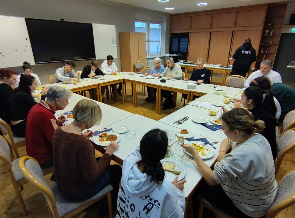 Nach zwei Stunden intensiven Schnippelns von Obst, Gemüse und Kartoffeln sowie des Garens der Gerichte wurde im Speiseraum der BBS ein leckeres Büfett mit den von den Teilnehmerinnen und Teilnehmern hergestellten Gerichten aufgebaut. Während des Es-sens war deutlich zu sehen, dass allen die angebotenen Speisen schmeckten. Auch diese weitere Zeit des Zusammenseins wurde von den Anwesenden ausgiebig für Gespräche genutzt.