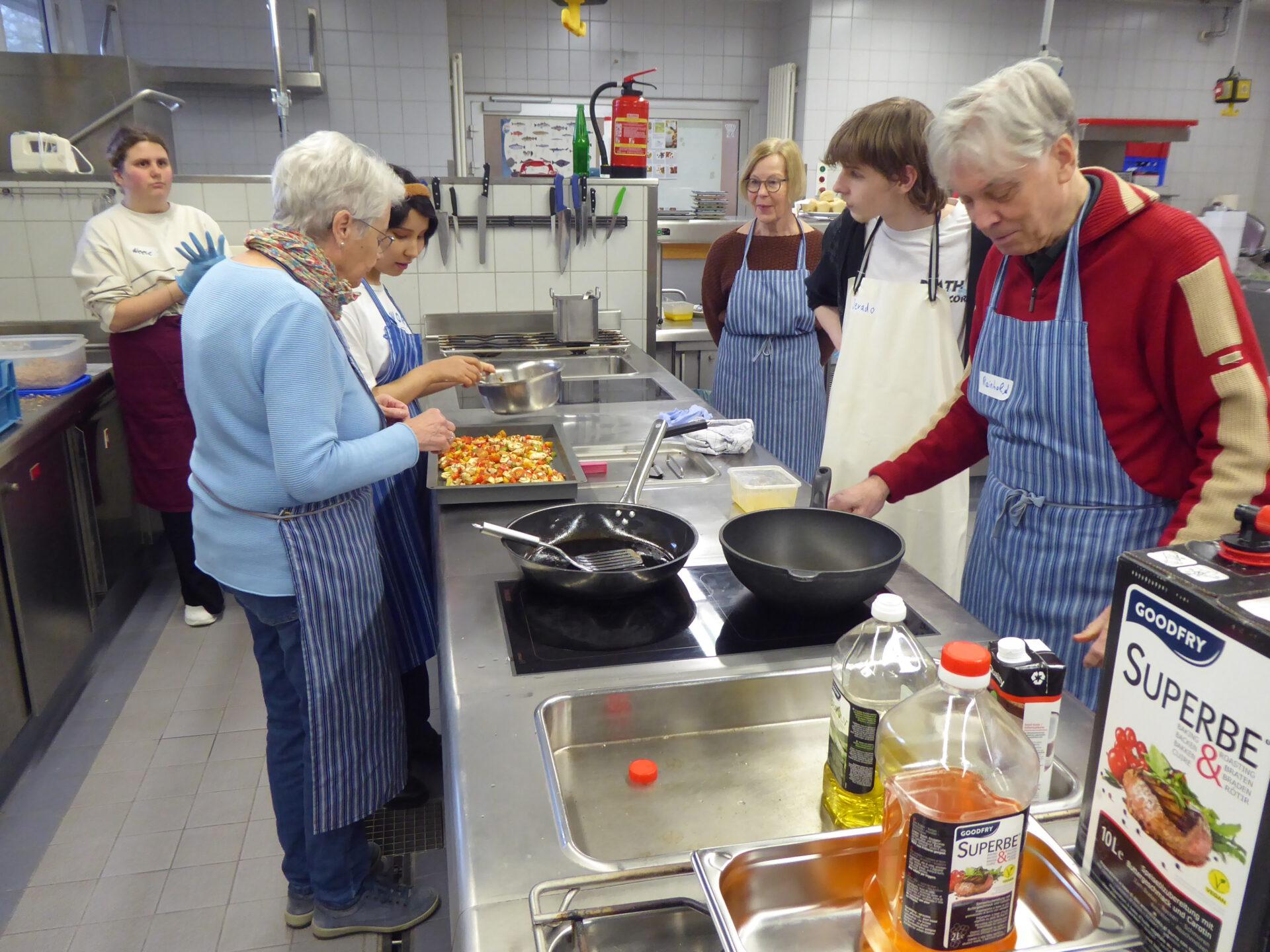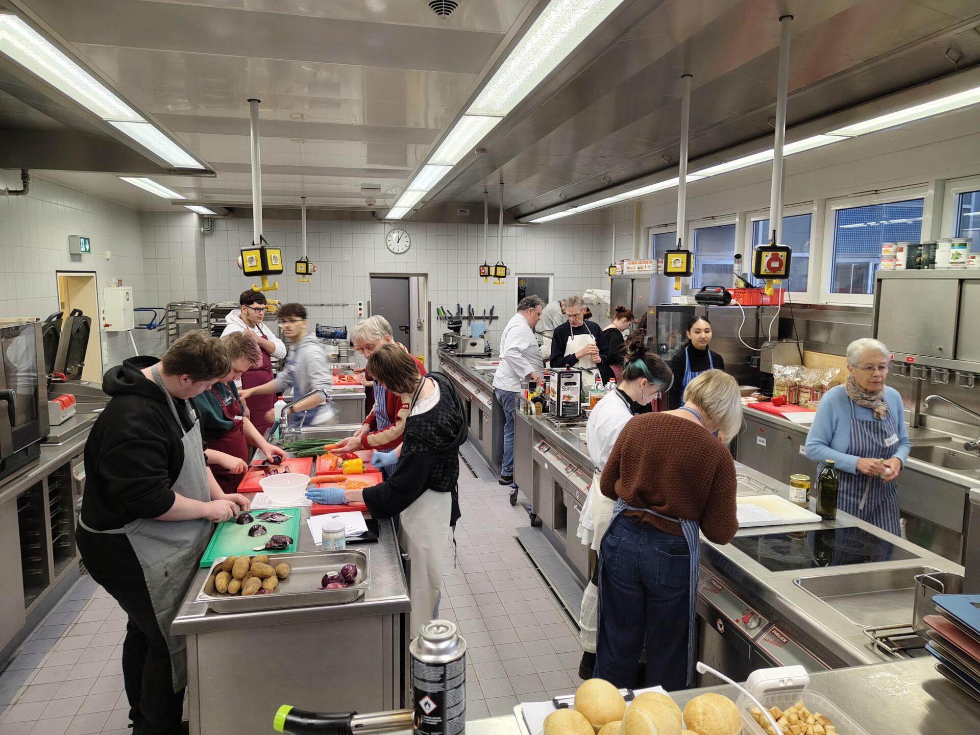 Die vom Koch-Profi Menges gut vorbereitete praktische Küchenarbeit auf der Grundlage von Rezepten, die die Teilnehmerinnen und Teilnehmern vorher erstellt hatten, begann mit der Einteilung von generations- und schulformübergreifenden Arbeitsgruppen. In diesen wurden Vorspeisen (Bruschetta und Hummus) vegetarische Hauptgerichte (Reis mit Gemüse, Kartoffelgulasch, mediterranes Ofengemüse) und Nachspeisen (Obstsalat mit Eis, Sahnepudding mit Weintrauben und Crunch) hergestellt. Es war eine Freude zu beobachten, wie harmonisch und gesprächsintensiv das Zusammenwirken von Jung und Alt an den Arbeitsplätzen in der Küche der BBS Stadthagen ablief. In den Begleitgesprächen ging es nicht nur um die Zubereitung der Gerichte, sondern auch um die Lebenserfahrungen der Älteren sowie die angestrebten Schullaufbahnen beziehungsweise Berufs-wünsche, Fragen sowie Probleme der Heranwachsenden in der heutigen Zeit.