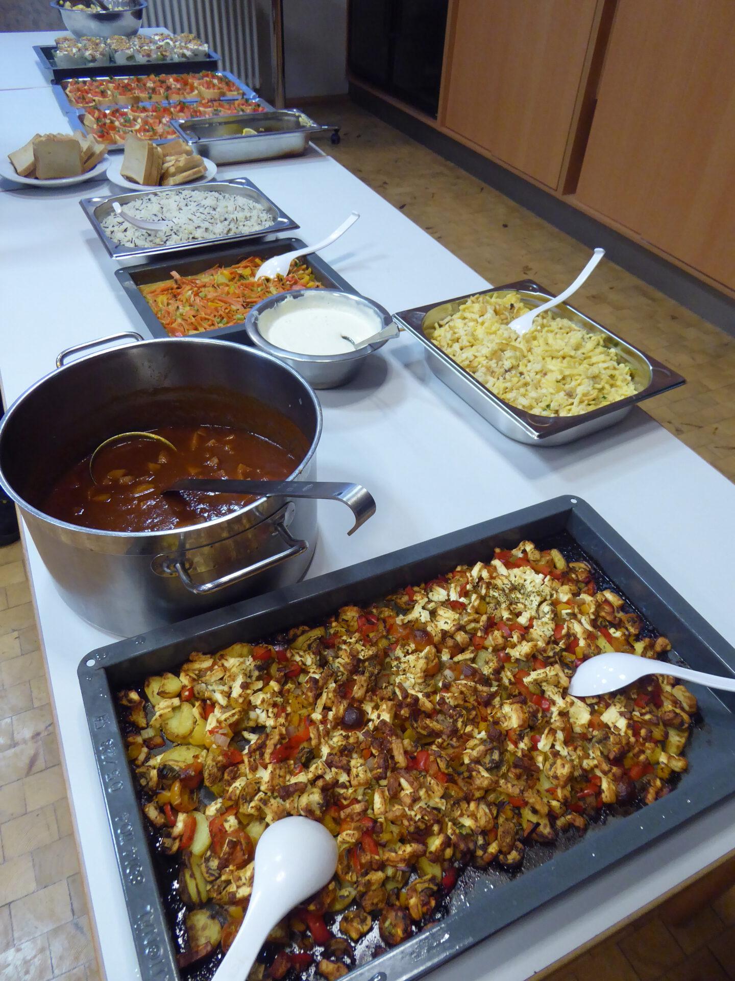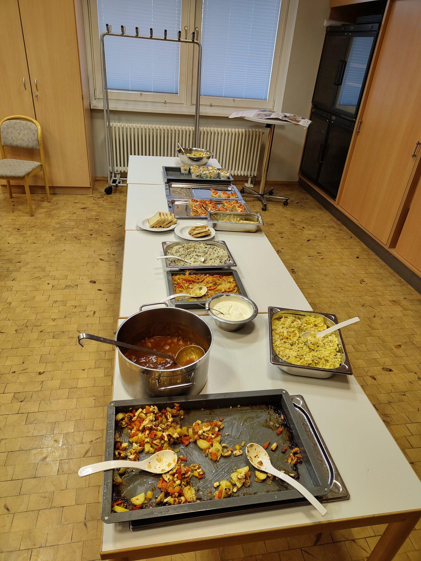 Nach zwei Stunden intensiven Schnippelns von Obst, Gemüse und Kartoffeln sowie des Garens der Gerichte wurde im Speiseraum der BBS ein leckeres Büfett mit den von den Teilnehmerinnen und Teilnehmern hergestellten Gerichten aufgebaut. Während des Es-sens war deutlich zu sehen, dass allen die angebotenen Speisen schmeckten. Auch diese weitere Zeit des Zusammenseins wurde von den Anwesenden ausgiebig für Gespräche genutzt.