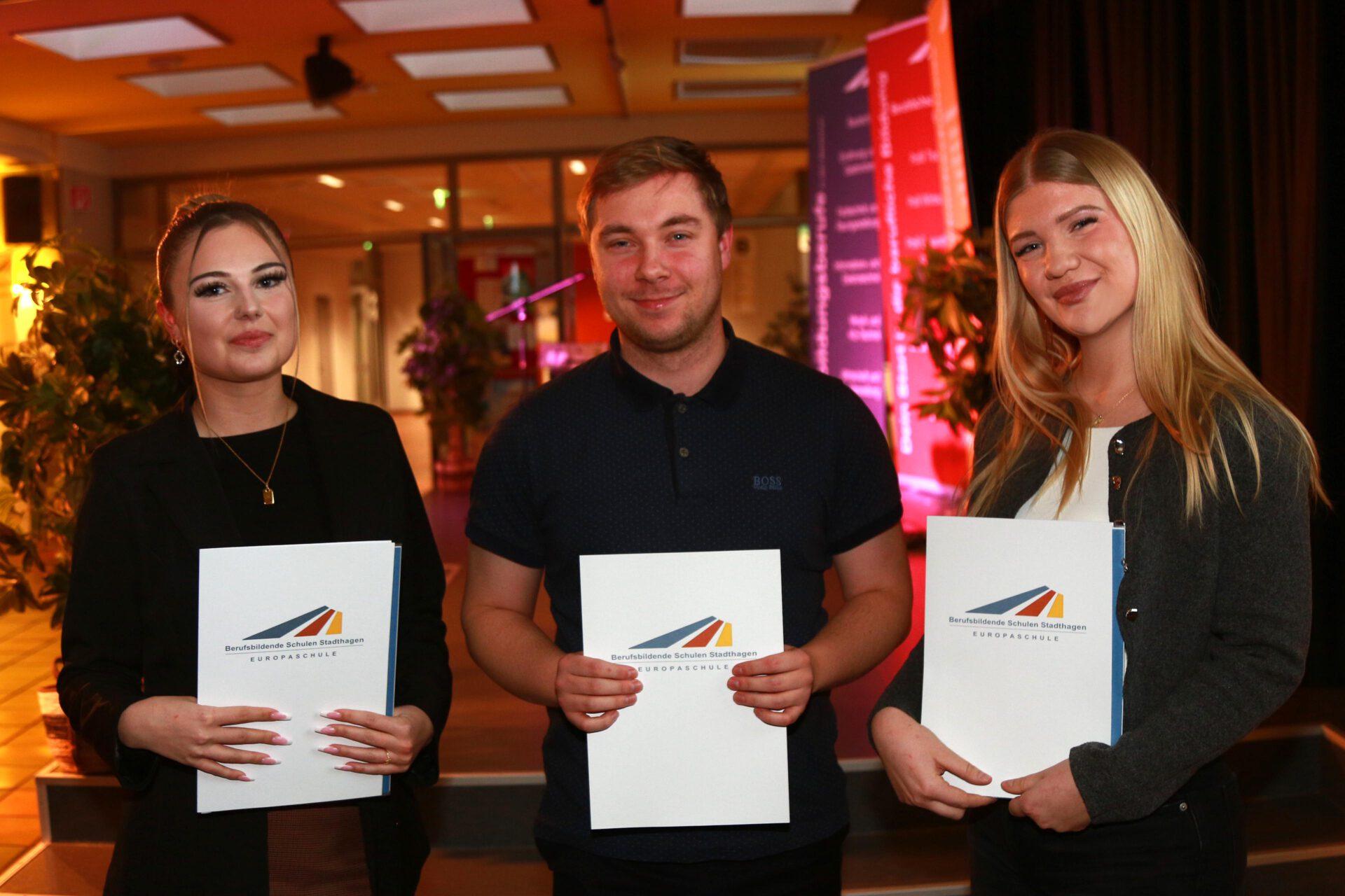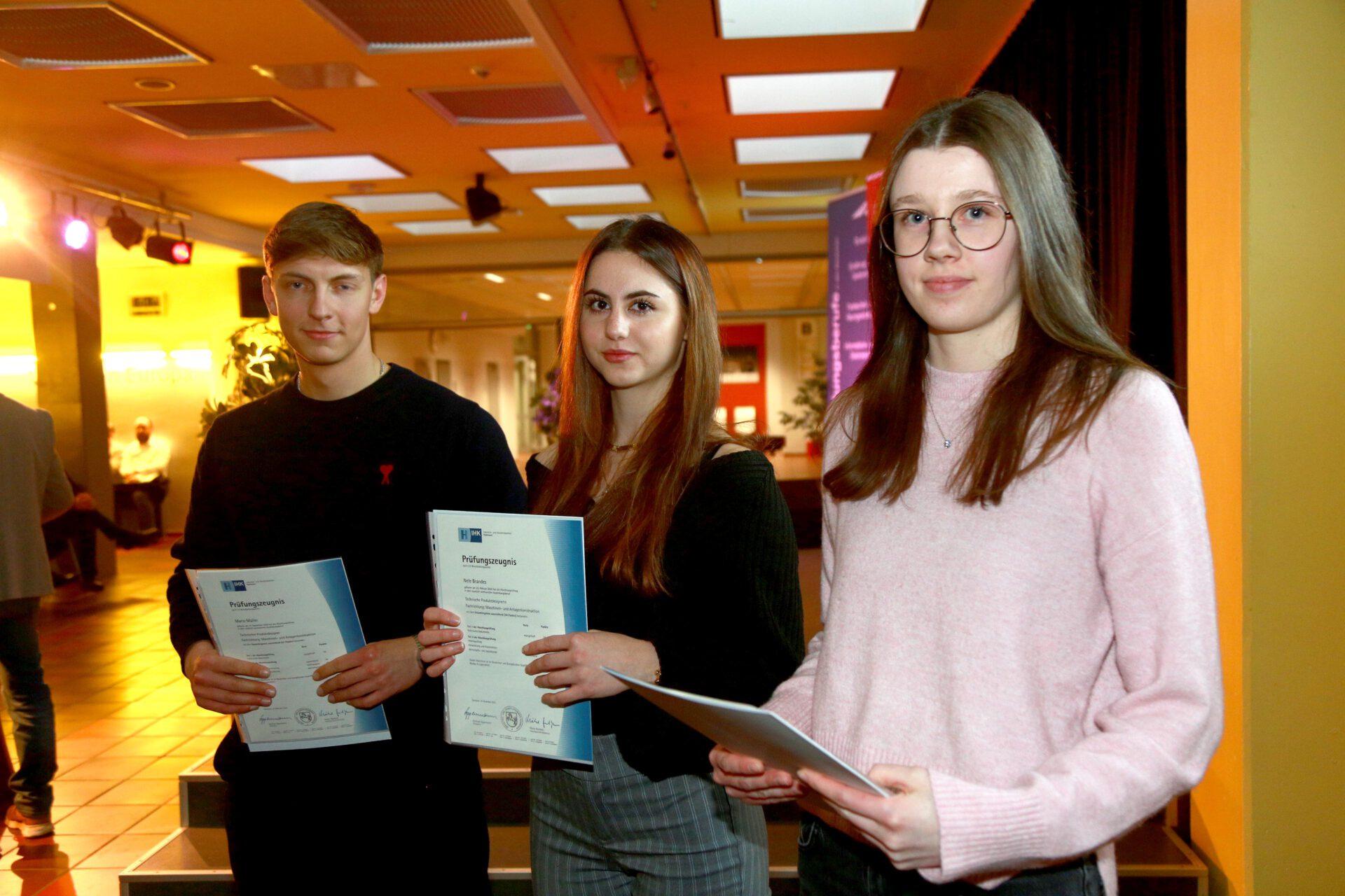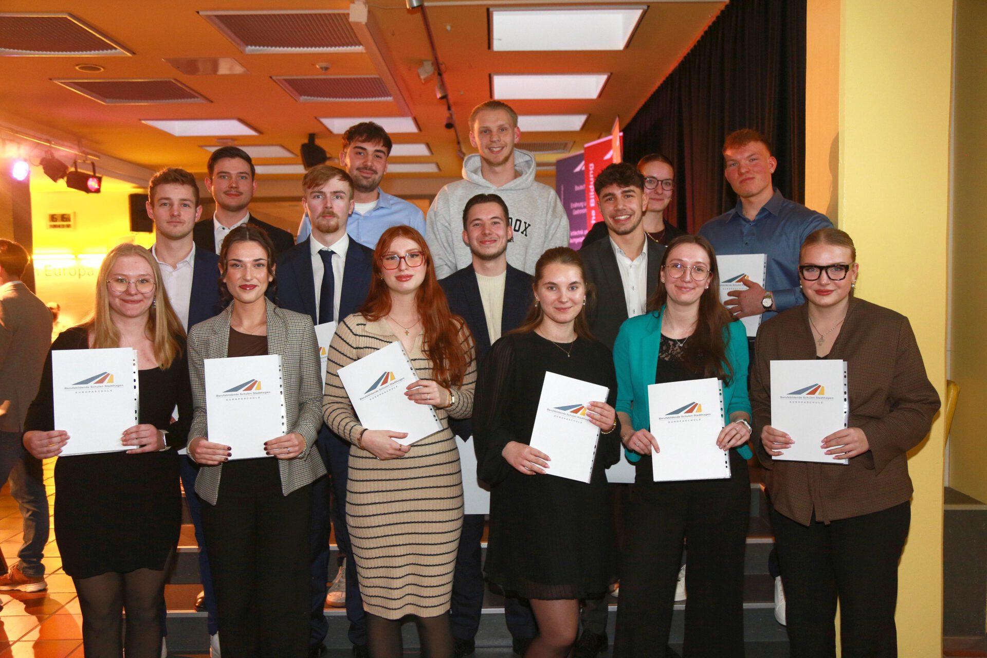 Im Rahmen einer Feierstunde im Forum der Berufsbildenden Schulen Stadthagen erhielten nach zweieinhalb bzw. dreieinhalb Jahren ehemalige Auszubildende ihre Schul- und Prüfungszeugnisse aus der Hand von Martin Wrede, Geschäftsstellenleiter der IHK Hannover in Stadthagen.