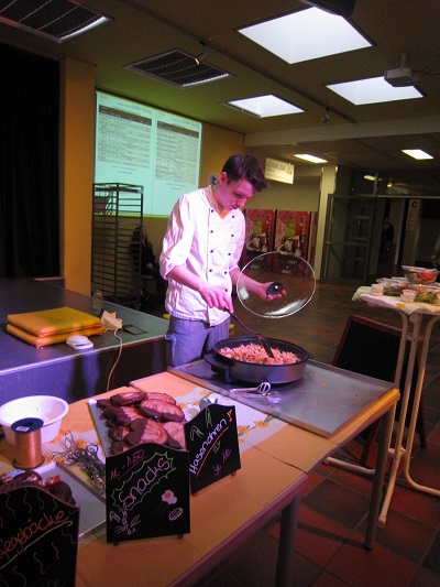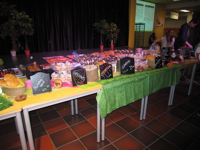 Natürlich durfte auch die Werbung nicht fehlen. Einige Schüler kreierten eine Powerpoint-Präsentation, andere erstellten Plakate und hängten sie im ganzen Schulgebäude auf. Am Donnerstagmorgen ging es bereits pünktlich um 7.30 Uhr in der Backstube heiß her. Da wurde gebacken, dekoriert und Snacks hergestellt. Andere Schüler schleppten Tische und den Verkaufstresen in die Pausenhalle. Der Verkaufsstand wurde liebevoll dekoriert. Die Highlights waren dieses Mal die frisch gebackenen Waffeln und das frisch hergestellte Rührei für die belegten Brötchen. Unterstützt wurden die Auszubildenden hierbei von einer UVB Gruppe. Die Schüler konnten dem Andrang kaum standhalten, denn die Kunden wurden durch den betörenden Duft scharenweise angelockt. Aber auch die anderen verkaufenden Schülerinnen hatten alle Hände voll zu tun. Die Schülerinnen und Schüler hatte perfekt kalkuliert, denn am Ende war beinahe alles ausverkauft und die Kasse voll!